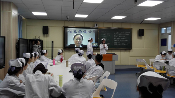 医学院与复旦闵行医院护理部教学团队经过多次沟通协商,决定闵行班《医院文化》课程采取面授与远程教学相结合的教学方式。在前一周面授课程结束后,3月21日,同学们在医学院实训楼智慧教室里,通过视频网络,与闵行医院翟老师进行了远程互动教学。