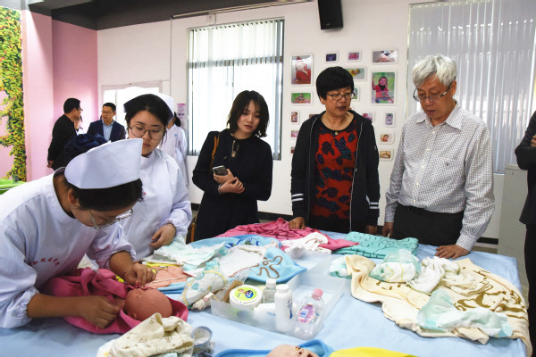 王鹤鸣一行先后参观了我校医学实训中心、艺术设计学院等,参观过程中,崔戴飞还向王鹤鸣一行详细介绍了我校护理人才培养、社会培训工作等情况。在随后的座谈交流上,崔戴飞表示,学校与广宇集团在养老护理人才培养上有很大的合作空间,希望能在社会培训类项目、养老护理标准化实训室建设、与学校相关专业的深度融合等方面进一步加强对接和合作;王鹤鸣详细介绍了广宇集团发展概况和产业发展规划,对我校人才培养特别是护理人才培养工作表示肯定,希望能在养老护理产业方面同学校一道就人才定向培养、专题性培训、医学实训一体化建设等方面展开合作。