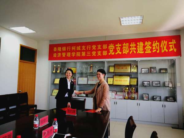 2017年11月1日,我校与浙江泰隆商业银行衢州分行就成立“泰隆班”达成合作协议,并签约,以大力推行我校工学结合、校企合作人才培养模式,为泰隆银行衢州分行储备人才。目前,泰隆班第一批学员已经上岗。为进一步深化合作,经济管理学院第三党支部与泰隆银行柯城支行党支部举行共建签约仪式,就我校支部建设、党员志愿服务、学生社会实践等方面,初步达成合作意向,通过共建活动平台、交流工作经验、共办实事好事等途径,促进党组织建设,谋求党支部工作的全面发展。