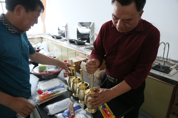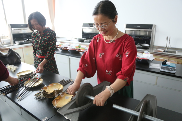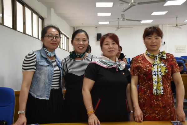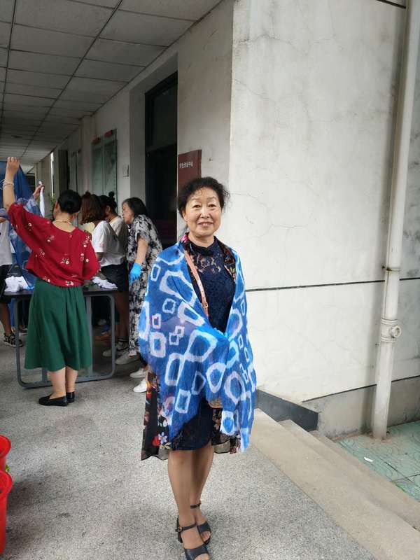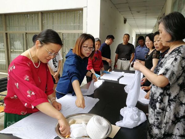 我校的退休教职工们体验了中药药品的辨认和研磨,参观了医学实训楼标本室,随后在艺术设计学院刘铮老师的帮助下,感受了我国民间艺术的风采——扎染的图案美、色彩美和形式美。在熟悉了扎染工艺的基本知识、扎染特点及制作技巧等方面的理论知识后,他们用皮筋、麻绳、玻璃珠、小木条等工具,将纯白手帕根据自己的喜好扎紧、染色、晒干。一幅幅色彩艳丽、图案变化无穷的扎染作品就做好了。