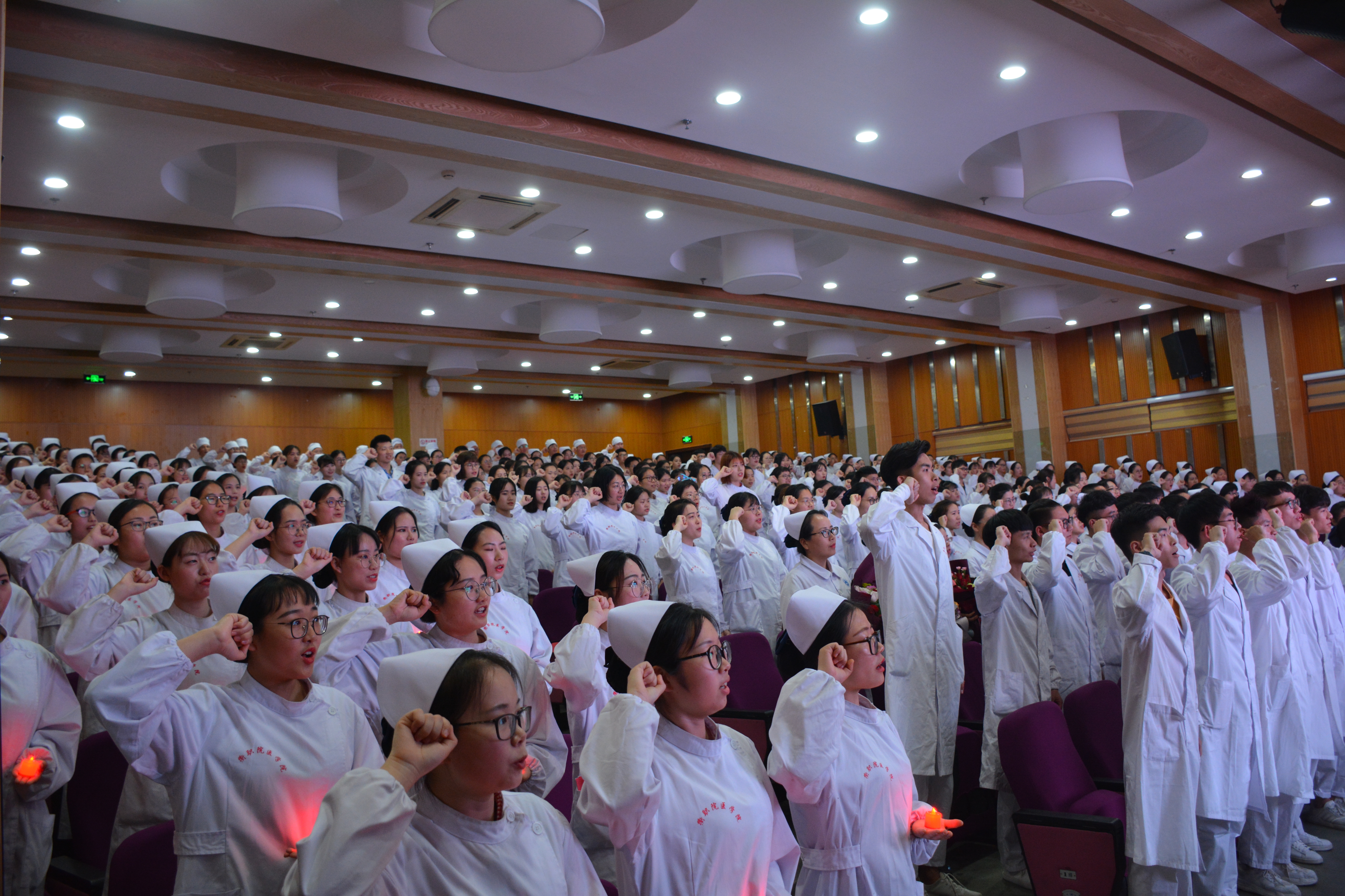 随着音乐声响起,护士加冕仪式正式开始。烛光闪耀、薪火相传,护生们身着白色护士装,面带微笑,迈着整齐的步伐走向主席台,缓缓下跪接受燕帽。罗烨老师带领全体护生进行了庄严的宣誓。