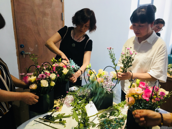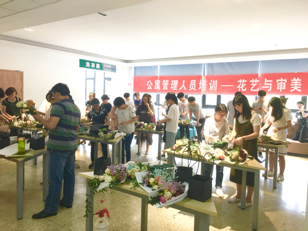 参与人员根据自己的想法,在相互交流中,一步步创作属于自己的插花作品。此次活动是为了促进公寓管理人员的交流,并通过让管理人员在夏日邂逅美丽的鲜花,提高他们的生活热情,为公寓管理工作增添一抹花色。(学生处 吴春红)