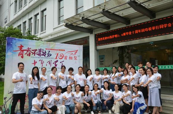 六月的校园绿意葱葱,繁花似锦,气象万千。6月2日,经过精心筹备,05级护理3、4两个班级近50名校友怀着喜悦的心情,从各地相聚“衢职”,参加在医学院多功能厅举行的主题为“青春不散场”的毕业十周年联谊会。医学院党总支书记暨班主任余文富、学工办主任裘俊、分团委书记赵宇略一同参加了此次联谊会。