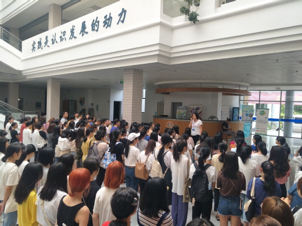 “入馆教育”是新生始业教育的重要模块之一,为了提高新生入馆教育的质量,图书馆领导高度重视、全面筹备,选派馆内业务骨干认真准备,并对各项教育培训环节进行了精心组织和明确分工。首先,新生班级先到一楼大厅集中,图书馆老师向他们简要介绍图书馆资源、环境、楼层布局等整体概况,随后由图书馆领导、各部室主任及其他骨干组成领队小组,分批带领新生班级参观各个楼层,详细介绍图书馆每个窗口的资源、服务及功能,讲解内容全面而丰富,包括图书馆独具特色的“两个中心”服务项目、如何阅览期刊杂志、如何利用图书馆的各类数字资源、如何通过查询台检索图书、如何借阅图书、如何通过手机客户端使用移动图书馆等。