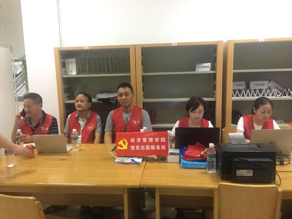 活跃在迎新现场的,除了学工办全体辅导员、所有新生班班主任外,还有经济管理学院党支部进行志愿服务所有教师,为2018级新生及家长解答本专业学科设置、学习方法、就业情景等问题。