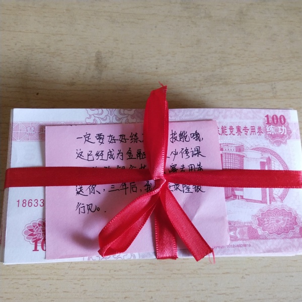 按照人才培养计划,金融管理专业要求学生,毕业前应先通过银行从业资格考试。为了鼓励2018级金融专业新生认真对待即将开始的点钞技能专业课,第一期泰隆班优秀学员方敏给该专业2435寝室新生留赠一沓银行技能竞赛专用券,并和他们约定,3年之后,泰隆银行,不见不散。