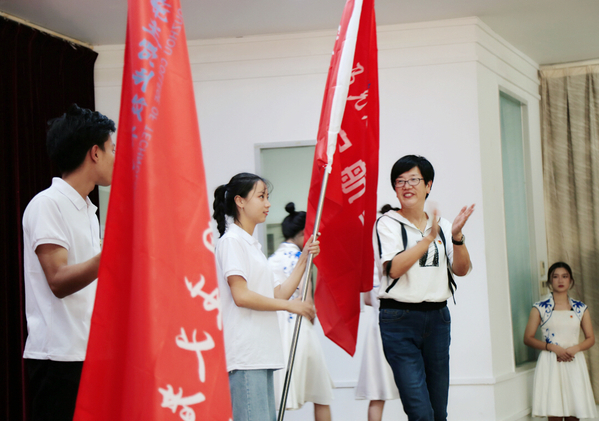 校党委书记崔戴飞为“青马金鹰班”、“青马启航班”授旗。鲜艳的旗帜饱含着学校党委对同学们的殷切期望,也激励着广大青年学子爱国、励志、求真、力行,为实现中华民族伟大复兴的中国梦不懈奋斗!
