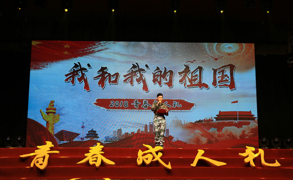 “2018青春成人礼”以“我和我的祖国”为主题,分为“爱国”、“励志”、“求真”、“力行”四个篇章。整场典礼以老师、学生的爱国励志情怀为主线,融合了舞蹈、歌曲、舞台剧、走秀、演讲等形式多样、精彩纷呈的节目,以寓教于乐的形式启迪2018级新生们热爱祖国、感恩祖国、报效祖国。
