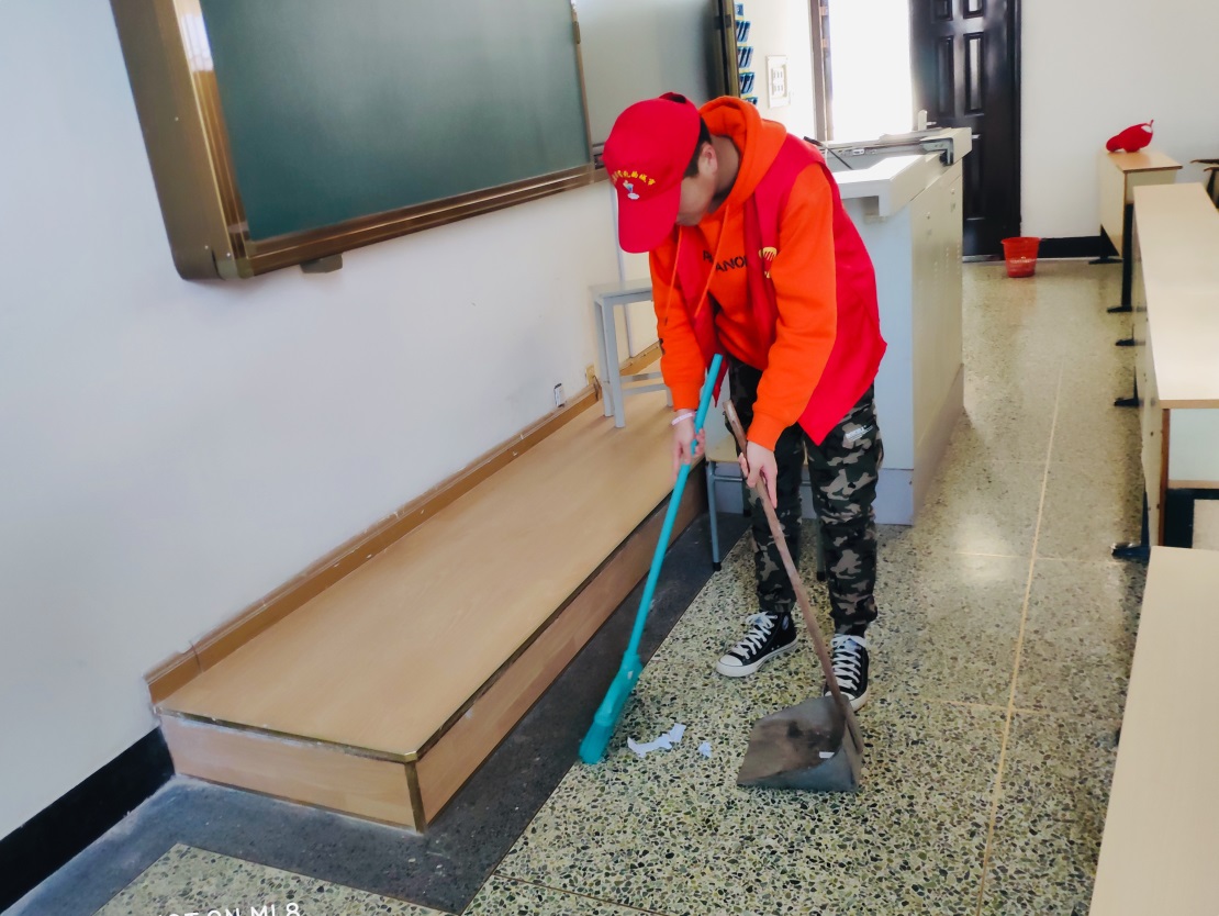 机电党支部学习小组和机制党支部学习小组分别赴东阶梯教室和西阶梯教室,清扫楼道维持教室整洁。