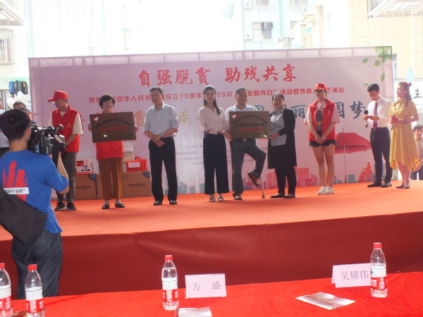 活动现场,该协会志愿者们除协同工作人员维持秩序、搬运舞台道具等外,还与府山街道残疾人居家照料中心的“憨豆儿”合作表演节目快闪“我和我的祖国”,共祝祖国繁荣昌盛。