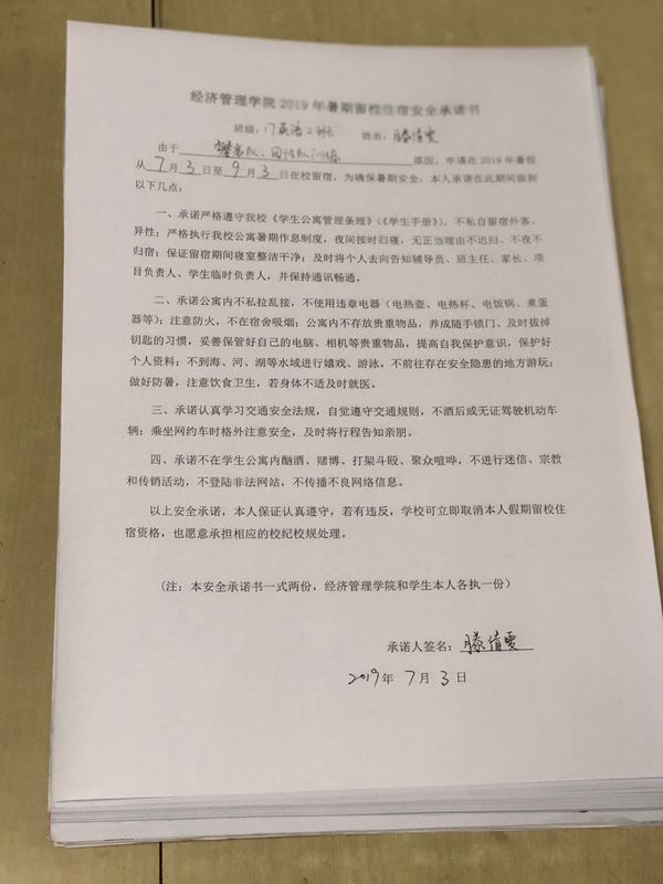 最后,所有暑期留校住宿学生签订并上交《经济管理学院2019年暑期留校住宿安全承诺书》。
