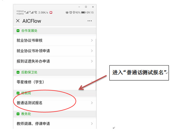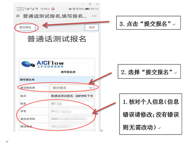 扫描二维码,关注“开元网页版智慧校园”公众号——通过 “学生服务”进入系统(账号为本人学号,密码为学号加字母a)——选择“网上办事大厅”——进入“普通话测试报名”——核对个人信息(如有错误,请修改),确认无误后选择“提交报名”——报名完成。(图示如下:)