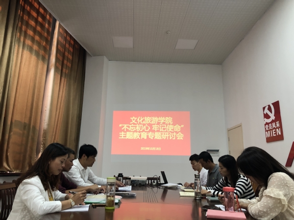 10月18日,文化旅游学院根据“不忘初心 牢记使命”主题教育实施要求,在学院会议室召开专题研讨会,学院班子成员就各自所选专题 “理想信念”、“担当作为”、“政治纪律和政治规矩”和各支部支委进行交流研讨。文化旅游学院院长、党总支书记郭大勇指出,作为工作在教师岗位上的普通党员,我们肩负着立德树人的重要使命,要有坚定的理想信念,要有勇于担当并有所作为的工作态度,同时要守纪律守规矩,知道什么能做什么不能做。