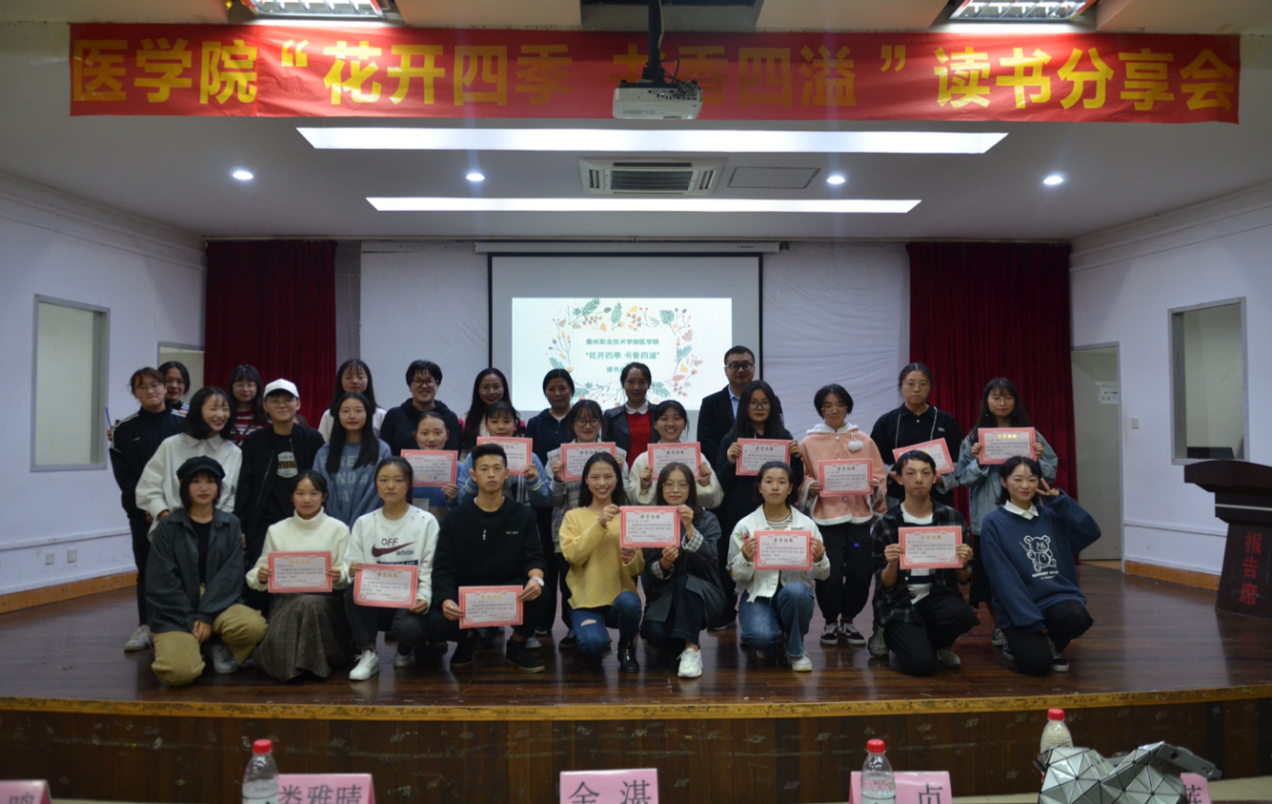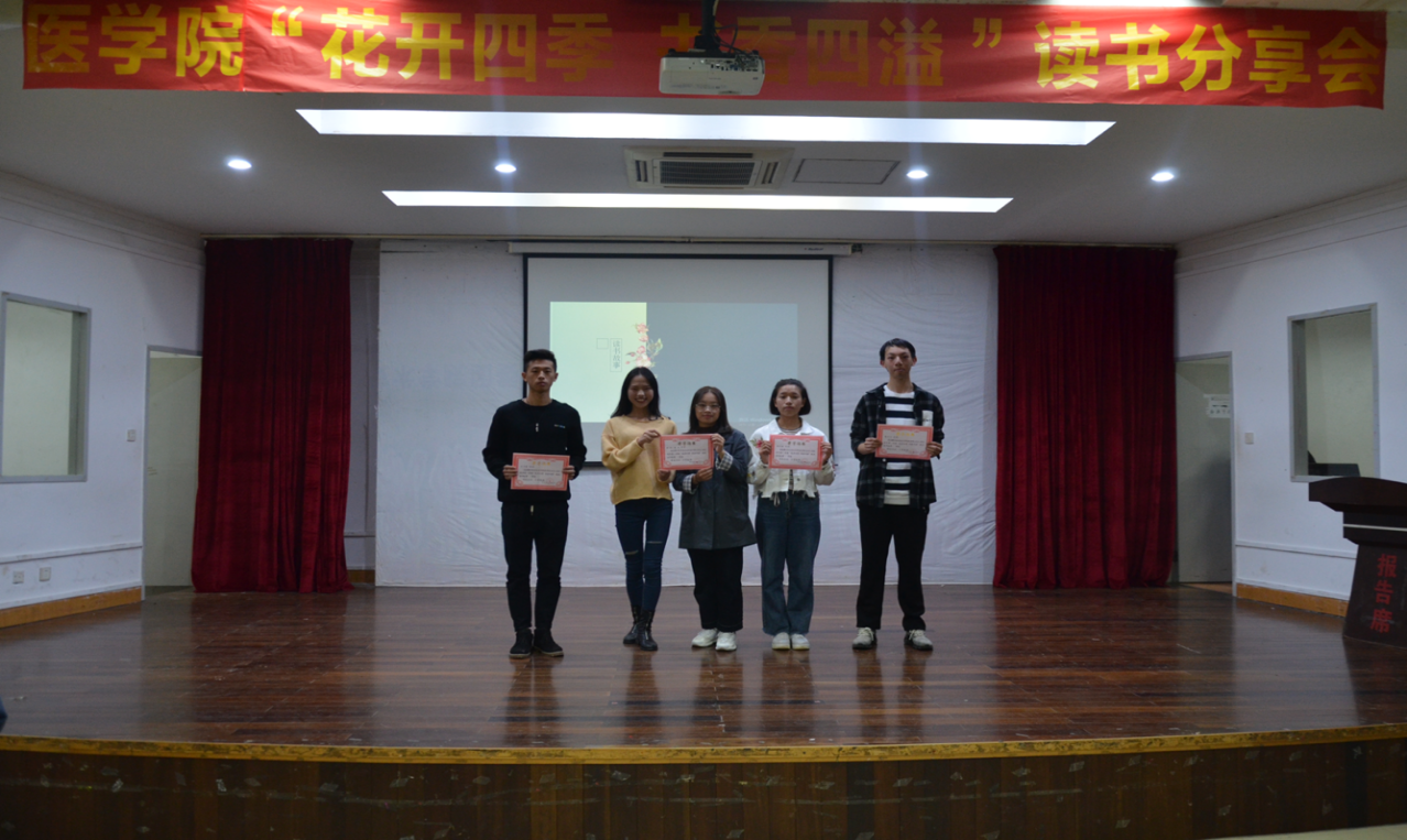 2019年11月6日晚18点30分,医学院于团务多功能厅开展“花开四季 书香四溢”读书分享会。医学院党总支副书记周贞与辅导员担任评委工作。本次比赛同学们以自己的读书故事为为主题,介绍一本对自己有独特意义或影响深远的书籍,并结合个人经历抒发个人心得。