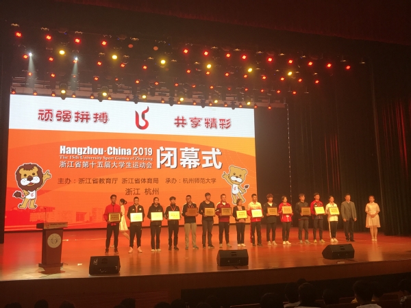 11月10日,浙江省第十五届大学生运动会在杭州师范大学圆满收官,本次大运会我校共参加了排球、羽毛球、健美操、武术、游泳、田径六个竞赛项目和一个阳光项目,共获得奖牌20枚,其中金牌14枚,银牌5枚,铜牌 3枚。同时,以团体总分第三名的优异成绩评为“校长杯”获奖单位。校党委副书记、校长江爱民出席闭幕式,并上台领奖。