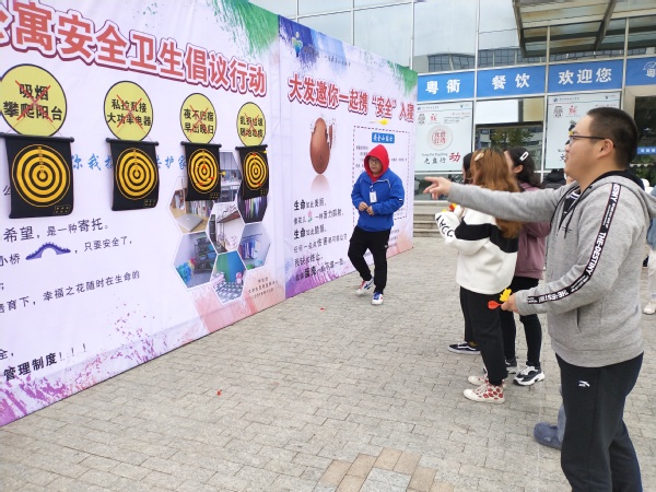 活动设有趣味安全知识答题、趣味危险电器识别、投掷飞镖等三项运动。趣味安全知识答题两人背靠背夹气球穿过写着“安全并不容易,要从小事做起”,“不使用大功率电器、不私拉乱接”,“不在校园内吸烟、不乱扔烟头”,“不夜不归宿、不攀爬阳台”,“大家一起努力,共创平安家园”的横幅,到达终点后回答消防安全知识,表示师生一起努力创建平安公寓。投掷飞镖向“拒绝大功率”、“拒绝脏乱差”、“拒绝攀爬阳台”、“拒绝吸烟”等内容的靶盘扔飞镖,表示师生坚决抵制公寓不文明行为的决心。趣味危险电器识别由一人指路,一人蒙眼穿过路障,走向危险电器,让同学们进一步认识到危险电器的危害。