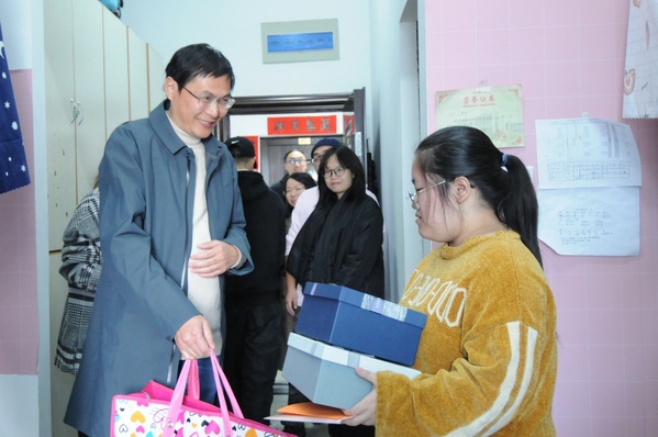 走访中,“爱心使者”逐一为学生圆梦,为学生送去了生活礼包,还送上专门定制的圆梦礼包:一双棉鞋、一个保温杯、一套书籍等等,现场学生对学校的关心纷纷表示感谢,并与老师们紧紧相拥。崔戴飞、王东升等一行人还亲切地慰问了寝室的同学们,与同学们一起合影留念。