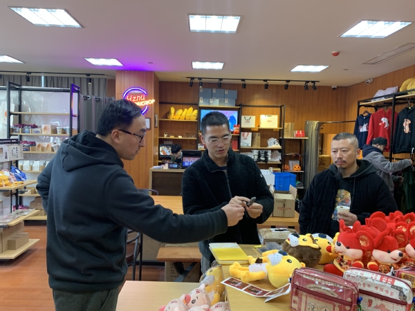 最后,艺术设计学院又赴杭州看望了杭州师范大学校园文创中心负责人13届设计毕业生刘超超,与他交流了现在校园文创产品开发和设计的相关内容,并参观了杭州师范师大学的校园文创商店。