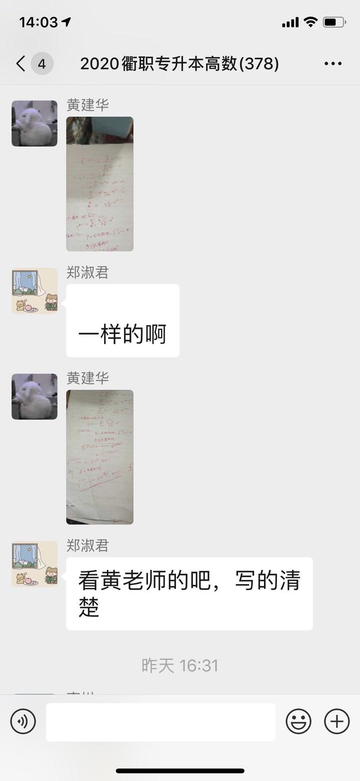 “专升本是许多衢职学子梦寐以求的心愿,4月份的统招专升本考试是他们唯一一次将第一学历改写为本科的机会,今年受到疫情影响,回校后面对面授课的时间还不能确定,但是目前没收到专升本考试推迟的消息,这个关键的复习阶段,一定要给他们做好知识保障。”黄老师说,学生们的问题经常较多较细较杂,很多时候要先帮他们补上相关知识点再解答问题,甚至很多问题可能十几分钟前刚回复过,又被其他问题刷新群消息,后面的同学再问一次,黄老师依然耐心地再次解答。微信解答没法达到课堂上边讲解边演算的效果,稍微复杂一些的问题,黄老师手写解题过程,然后拍照回复,他一个步骤也没省,旁边还标注好每一步用到的知识点,作为上下两步变形变换的依据,这样一来,就算不是特别复杂的问题,常常也是满满一页A4纸的解题过程,学生看完直呼清楚明了。为了不刷屏,尽可能的让其他同学也看到有关问题的答疑,那些稍微简单的问题,黄老师就通过键盘打出那些含有大小写字母、上下角标的复杂数学符号,对于一个上了年纪的人,这却不是一件容易的事。“好几个知识点老是记不住,黄老师说那是因为没有透彻理解来龙去脉,不知其所以然。所以他特意去给我在百度上找了解答发给我,动态图那种,看完以后豁然开朗,还便于记忆。”17中药1班朱莱蒙说。黄老师为了某几个问题,花了些功夫上网找这样图文并茂的链接,他手机里还存了几个相关知识点的网页,他说,可能后期还会有同学需要,存着备用。