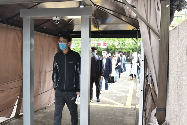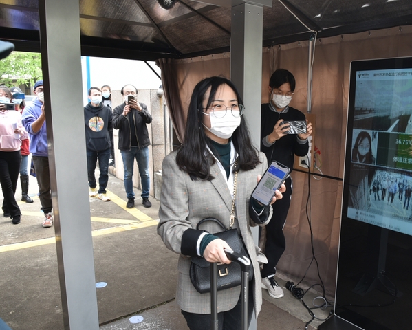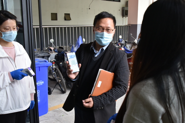 公寓工作人员检查健康码,引导学生间隔 1 米排队有序测温入寝。