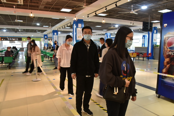 前往餐厅,按规定进入洗手区餐前洗手,分别从食堂一楼南门、二楼西南侧门经测温正常后进入餐厅。