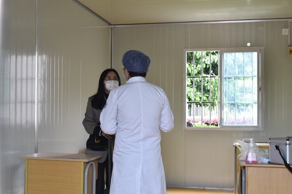 在校门测温通道体温检测时发现一“学生”体温38℃,立即开展发热“学生”应急处置演练。