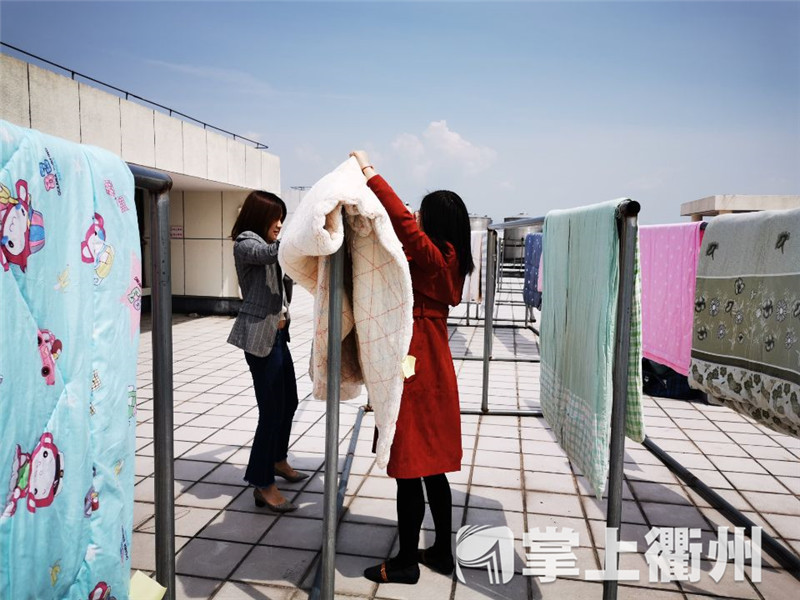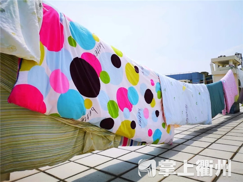 据了解,除了帮学生晒被子,衢职院还进行了多项返校准备工作,包括全面消杀、给地面粘贴排队距离标识、准备测温防疫物资、安排志愿者岗位以及复学实地演练等。“希望以一个安全又温暖的环境来迎接同学们‘回家’!”老师们说。