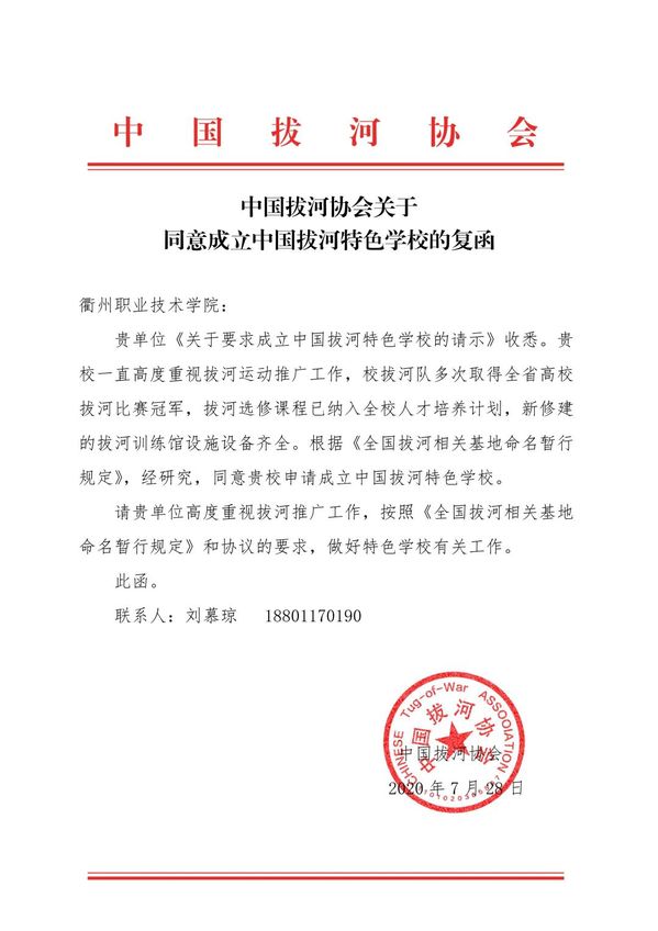 今年7月,中国拔河协会函复我校同意成立开元网页版中国拔河特色学校。在函复内容中,充分表达了对于我校高度重视拔河运动推广、校拔河队多次取得全省高校拔河比赛冠军以及趣味拔河课程融入到学校相关专业人才培养计划等方面工作的高度肯定。