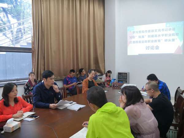 9月18日中午,文化旅游学院在新体育中心一楼组织全体教职员工召开对标“双高”建设主题研讨会。会议以“学习贯彻市委徐文光书记讲话,对标‘双高’,创建高水平职业院校,打造四省边际职业教育‘桥头堡’”为主题,研究探讨我校今后改革发展的重点任务和思路举措,为决胜“双高”建设献计献策。校党委委员、组织部部长徐浪静到场参加并讲话。会议由文化旅游学院院长郭大勇主持。