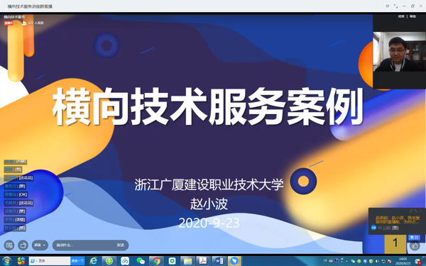 横向技术服务案例介绍专题讲座中,赵小波老师以江广厦建设职业技术大学——网创“双十一”校企科技合作为案例,分享了他做横向项目的一些经验,他首先介绍了项目合作要将合作意愿作为首要标准、其次是企业的规模、影响力和业绩,最后是企业是否有自身的质量体系。另外分别从项目合作企业、合作历程、项目流程、多赢结果等方面作了详细的介绍。