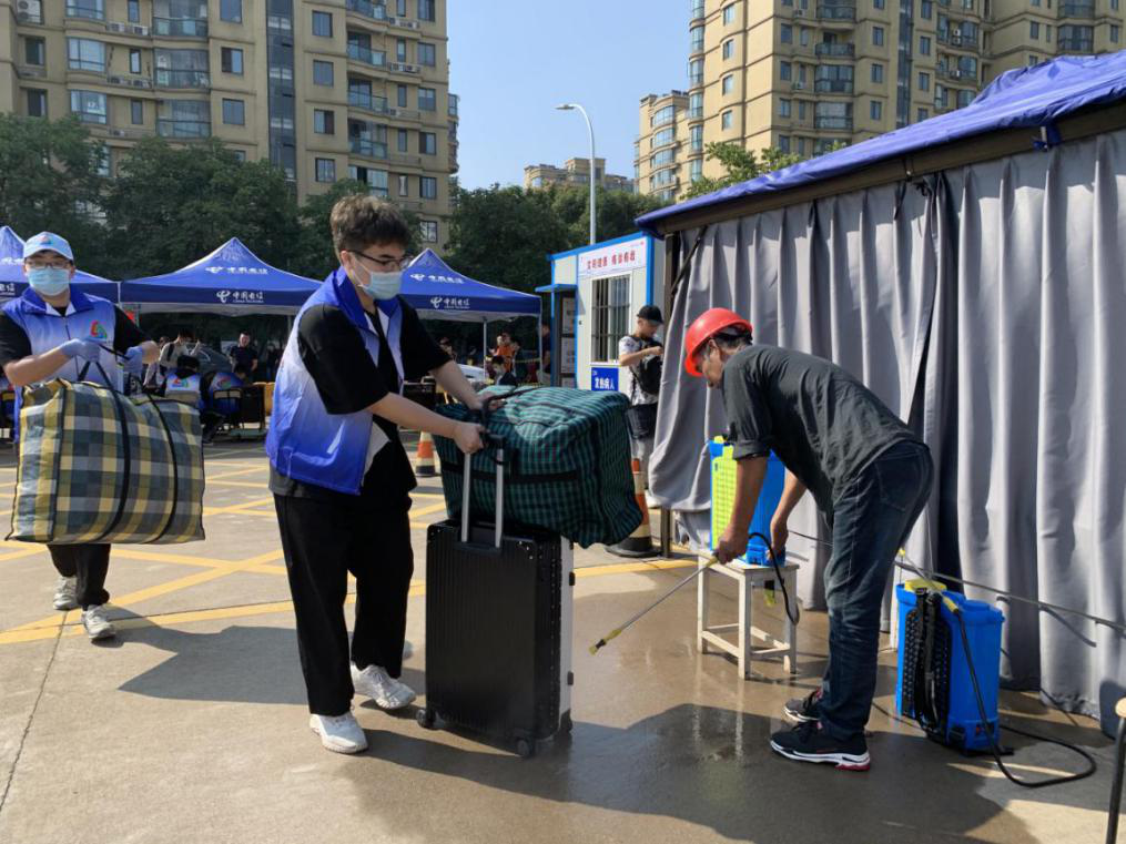 迎新工作如火如荼,到处都是忙碌的身影。在火车站、汽车站、学校南门、学生公寓,活跃着一群身着特色马甲背心的迎新志愿者们,他们争先恐后地接过沉甸甸的行李,指引新生测温、带到相应的报道点后,引导他们到寝室。