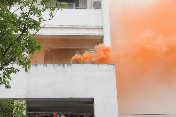 疏散警报响起,各楼幢学生辅导员及公寓管理员发现火情后,立即引导学生疏散,同学们一边用湿毛巾或身上的简便器材护住口鼻,按照预定逃生路线迅速疏散到指定地点,整个疏散过程有序高效。