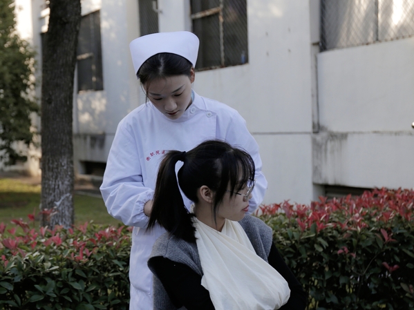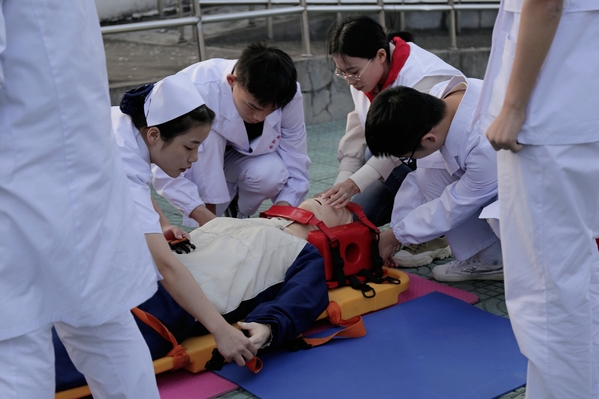 在演练中抢救出来的2名伤员进行现场包扎,同时安排4名学生用担架将模拟伤员抬到指定地点,对模拟伤员进行心肺复苏救治等。