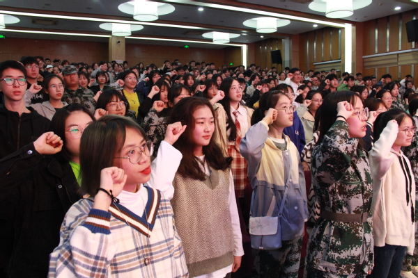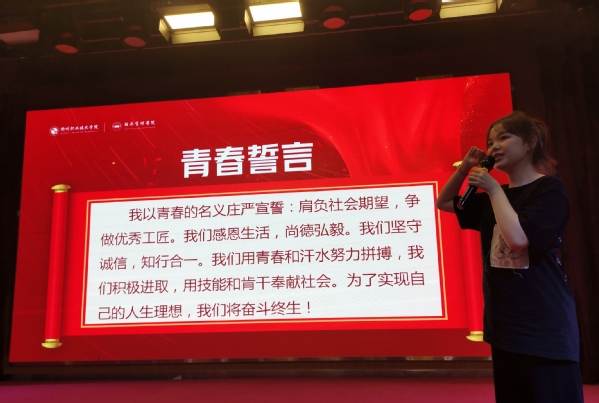 随后,全体新生在20连锁1班吴佳芯同学的带领下发表青春誓言:我以青春的名义庄严宣誓:肩负社会期望,争做优秀工匠。我们感恩生活,尚德弘毅。我们坚守诚信,知行合一。我们用青春和汗水努力拼搏,我们积极进取,用技能和肯干奉献社会。为了实现自己的人生理想,我们将奋斗终生!愿所有2020级新生谨记誓言,积极进取,努力奔跑,无惧风雨,迎着朝阳,为梦想蓄力。