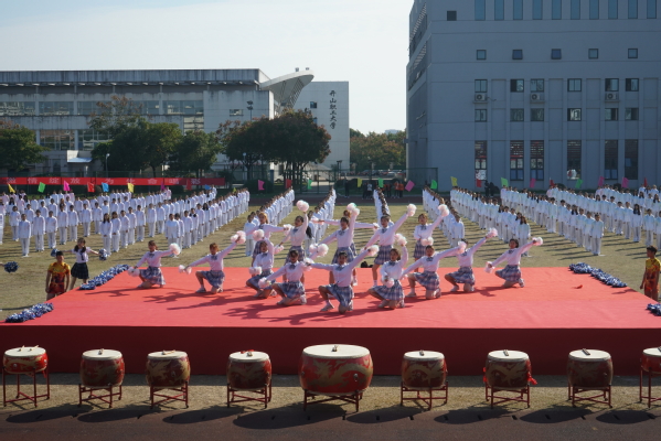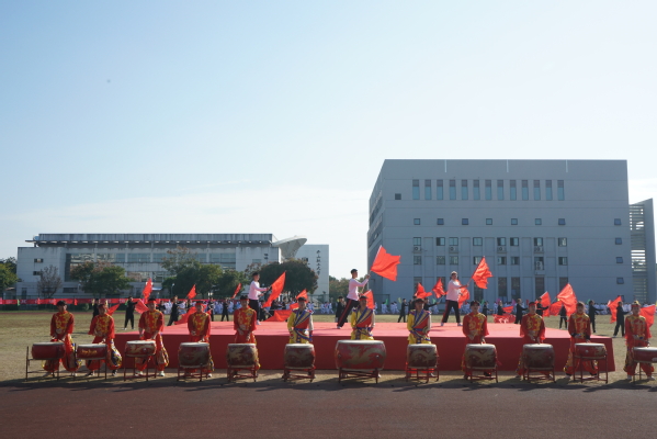 休闲体育专业的同学为大家带来旗鼓表演。红旗飘飘、战鼓雷鸣;由六个二级学院的400名2019级同学共同表演的节目是健身气功——八段锦,整齐划一,修身养性;校健美操舞姿曼妙,他们跃动的步伐洋溢着青春的活力,脸上欢快的笑容充满着自信,带动了会场的欢腾。