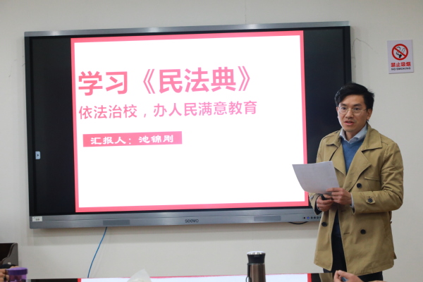 本次会议邀请了马克思主义学院池锦刚老师主讲。池锦刚从《民法典》的重大意义、功能定位、创新发展以及开启依法治校新篇章四个方面进行了解读。
