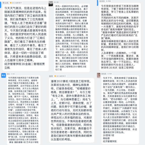 谢高华,浙江省衢州市横路乡贺邵溪人,曾任浙江省义乌县委书记,衢州市常务副市长等职。2017年,荣获“全国商品交易市场终身贡献奖”。2018年12月18日,党中央、国务院授予谢高华同志改革先锋称号,颁授改革先锋奖章,并获评“义乌小商品市场的催生培育者”。 马院带队教师结合谢老的生动事迹,围绕以改革创新为核心的时代精神分四个部分内容开展现场教学,介绍了“改革先锋”谢高华的辉煌人生,向学生们详细生动地展示了“谢高华精神”,即实事求是的担当作为精神、无私无畏的开拓创新精神、勤政爱民的公仆服务精神,学生课后纷纷畅谈自己的感受。