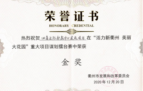 12月20日,在衢州市发展和改革委员会举办的“活力新衢州 美丽大花园”重大项目谋划擂台赛中,经过激烈角逐,我校申报的“四省边际职教中心建设”项目在20个参赛项目中脱颖而出,荣获金奖。