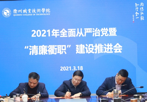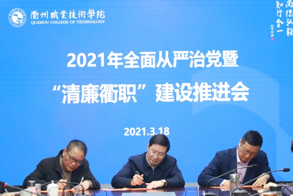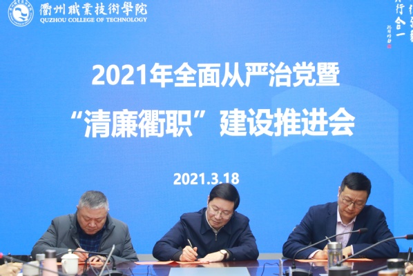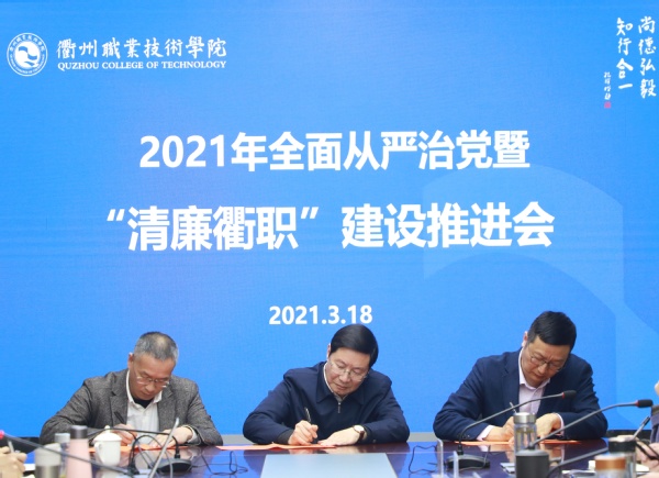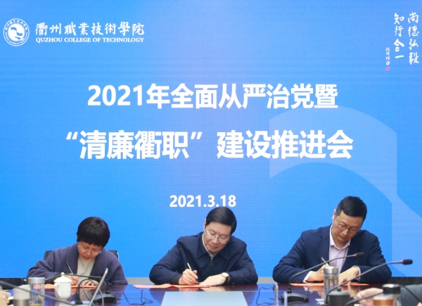 3月18日下午,我校召开2021年全面从严治党暨“清廉衢职”建设推进会。会议的主要任务是深入学习贯彻习近平总书记关于推进全面从严治党向纵深发展的重要指示精神,全面贯彻落实十九届中央纪委五次全会、省纪委十四届六次全会和市纪委七届五次全会部署,总结2020年学校全面从严治党工作,部署2021年全面从严治党和“清廉衢职”建设工作。会议由校长吕延文主持,校党政班子成员、校纪委委员、各部门(单位)党政主要负责人,纪检室全体干部参加。