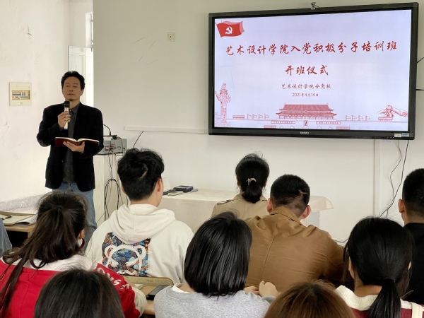 4月14日,艺术设计学院在艺术楼三楼多媒体教室举办入党积极分子培训班,对入党积极分子进行培训。艺术设计学院党总支书记叶云龙、副书记范洪梅出席开班仪式。