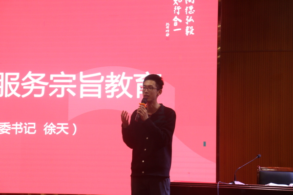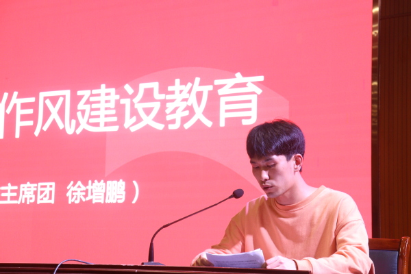校学生会执行主席徐增鹏带领与会学生干部学习《关于学联学生会工作人员改进作风服务同学的若干规定》,号召全体同学恪守学生本分、牢记服务宗旨、永葆理想情怀、勤勉务实做事、营造平等氛围、摒弃庸俗习气,建设一支胸怀理想、心系同学、品学兼优、作风扎实的学生会学生组织队伍。