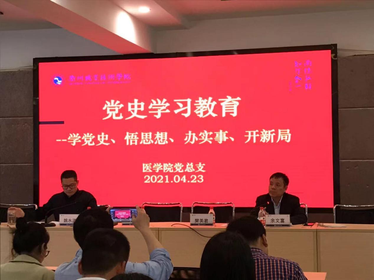4月23日下午,医学院党总支在医学实训中心多功能厅召开全体党员大会,传达市委副书记、市长汤飞帆同志党史学习教育专题宣讲精神,并组织学习了中共中央印发修订后的《中国共产党普通高等学校基层组织工作条例》,会议由党总支书记余文富主持。