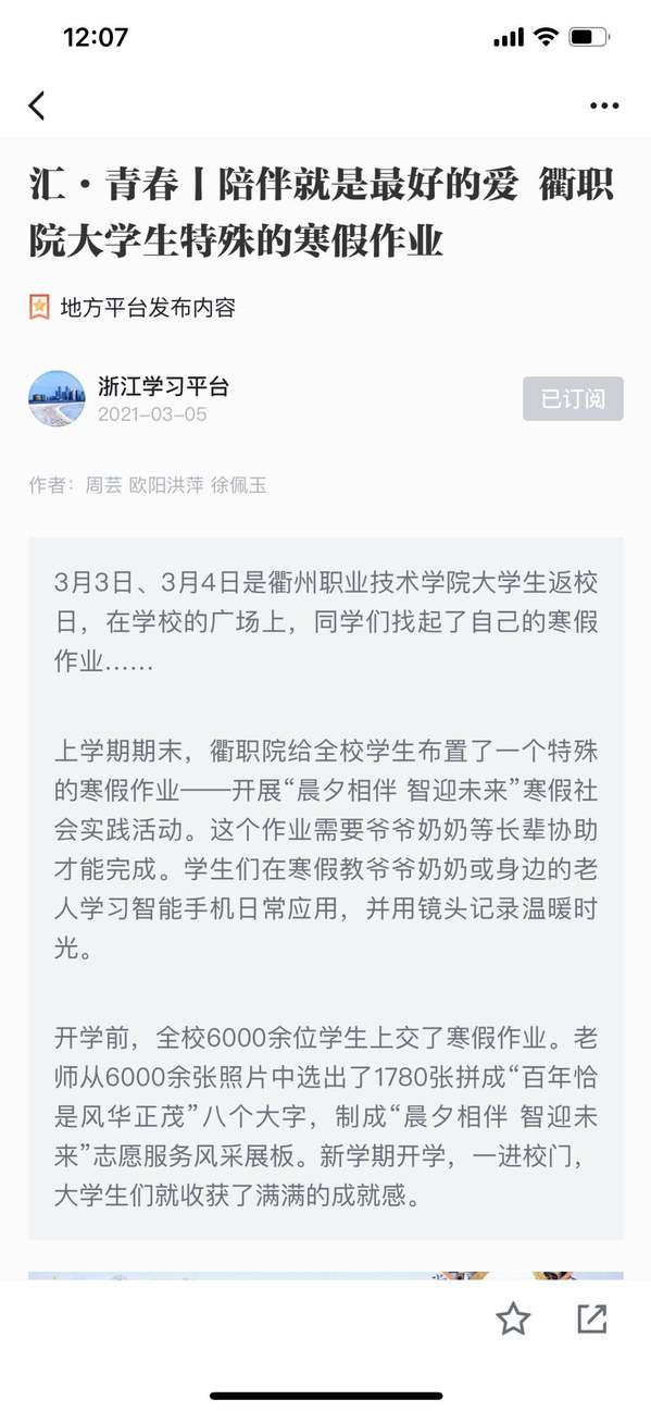 上学期期末,衢职院给全校学生布置了一个特殊的寒假作业——开展“晨夕相伴 智迎未来”寒假社会实践活动。这个作业需要爷爷奶奶等长辈协助才能完成。学生们在寒假教爷爷奶奶或身边的老人学习智能手机日常应用,并用镜头记录温暖时光。