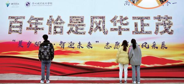 开学前,全校6000余位学生上交了寒假作业。老师从6000余张照片中选出了1780张拼成“百年恰是风华正茂”八个大字,制成“晨夕相伴 智迎未来”志愿服务风采展板。新学期开学,一进校门,大学生们就收获了满满的成就感。