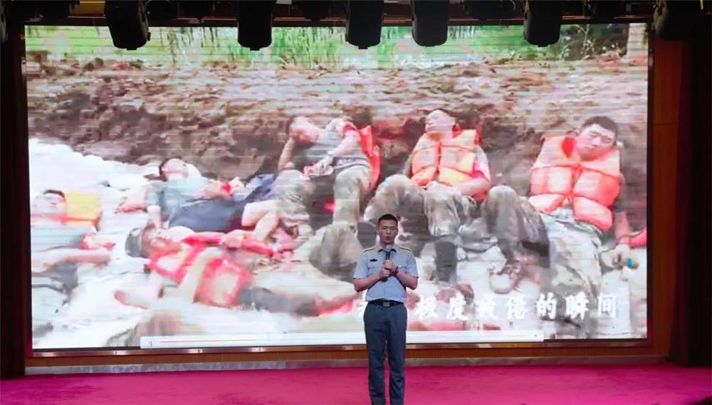 艺术设计学院学生张佳豪带来宣讲《青春无悔》,通过自己的抗洪经历去宣讲中国人民解放军如何在和平年代发光发热,通过场景重现来让人们了解到灾难来临时的残酷,也让人们在关键时刻众志成城齐心协力去办一件事,激发人们对生活环境的满足和感恩。