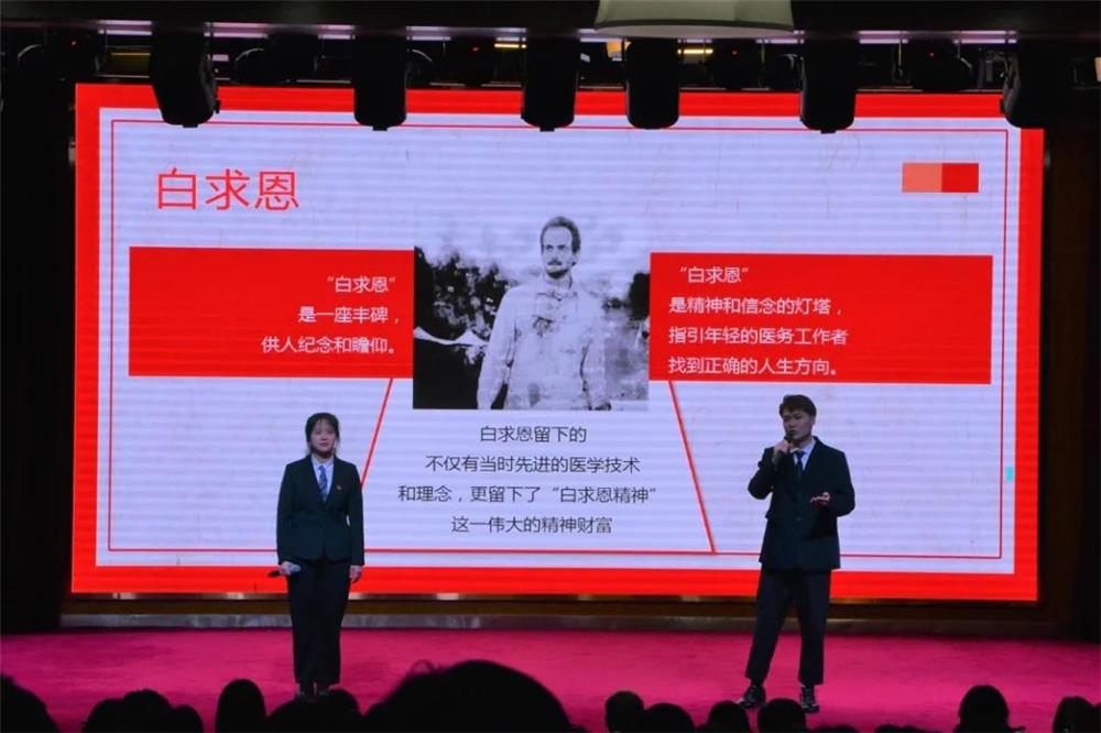 医学院学生李雨珂、吕俊安带来宣讲《不忘白求恩精神 光明初心永存》,宣讲以“白求恩精神”引入,结合我校医学院师生抗疫故事和自身感悟,鼓励广大青年肩负历史使命、坚定前进的信心 。