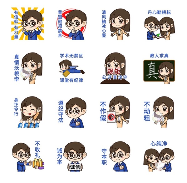 为打破廉洁宣传教育给人的传统刻板印象,开元网页版探索创新,从习近平总书记关于“四有好老师”、“四个引路人”、“四个相统一”重要讲话精神和《新时代高校教师职业行为十项准则》等中提炼精神内核,推出廉洁从教IP形象——“清清”和“莲莲”,并制作”清莲衢职”表情包发布推广,以更加生动的方式强化纪律规矩意识,增强廉洁教育的亲近感。