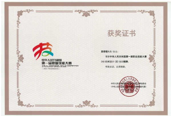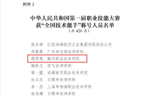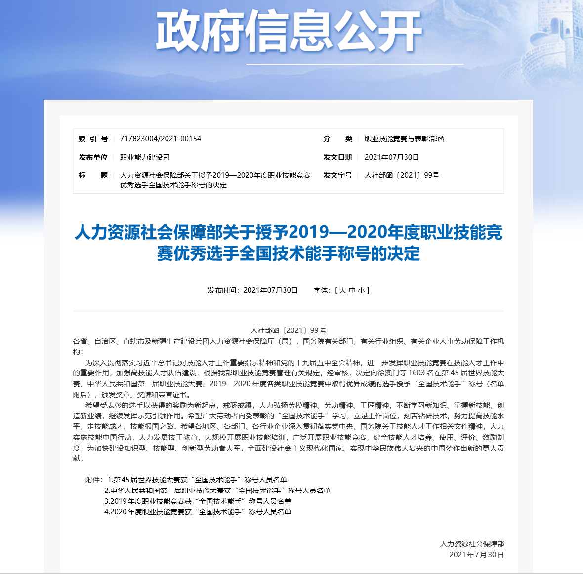 7月30日,人社部发布《关于授予2019—2020年度职业技能竞赛优秀选手全国技术能手称号的决定》(人社部函〔2021〕99号),我校邵思程老师荣获“全国技术能手”称号。