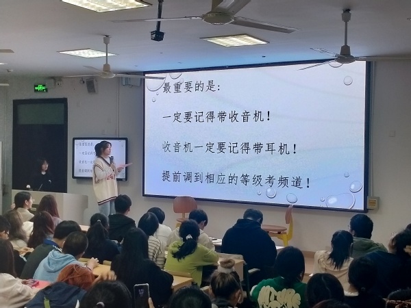 第二期学长学姐来了,从上学期英语等级和计算机等级考试的学生中,遴选了四位优秀代表,有过英语六级的机电工程学院学长,有组团考级,纷纷过英语四级的学姐们。学长学姐们从备考50天出发,提醒学弟学妹们提前开展备考,培养良好备考习惯,推荐优秀自学网站等角度开讲。
