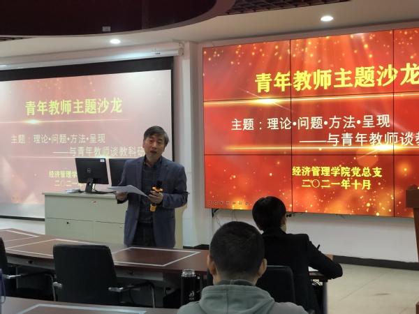 为提高教师干部队伍科研创新能力,助推我校双高院校建设和我院商贸专业群建设,10月29日,经济管理学院在实训室210举行十月份青年教师主题沙龙,经济管理学院院长朱芝洲教授进行了题目为《理论•问题•方法•呈现:与青年教师谈教科研》的分享。